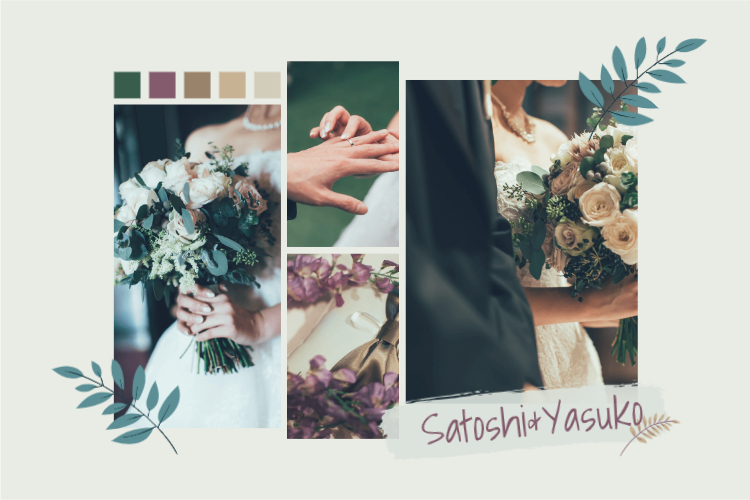 - Choose colors: Undoubtedly, color scheme has a great impact on the overall look and feel of your design. You can search for a variety of wedding color palette suggestions on the Internet. You might see color harmonies here. One of the most popular combination colors is using green with gold or rust to trigger calming and energizing feel.